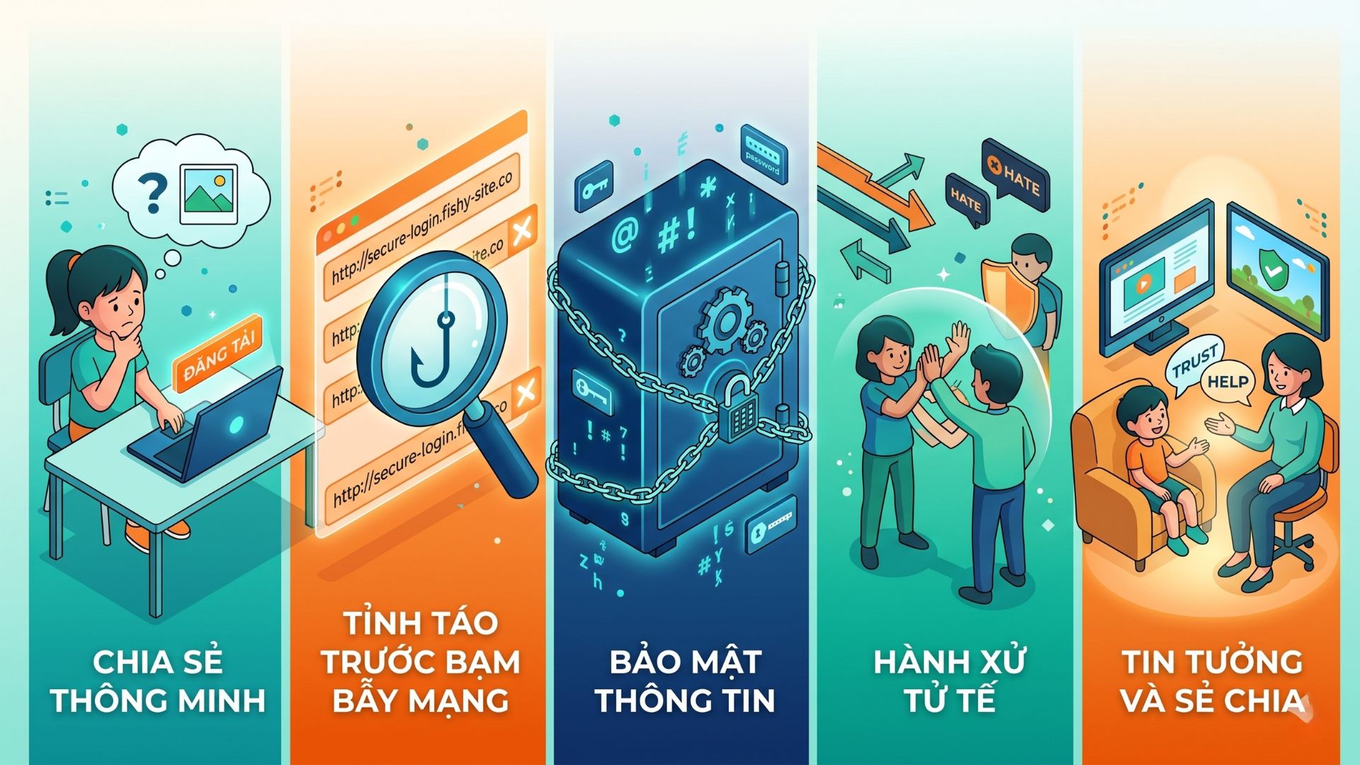 - Hành xử tử tế: Xây dựng văn hóa mạng văn minh, nói không với bắt nạt trực tuyến và biết cách bảo vệ bạn bè trước các nội dung tiêu cực.