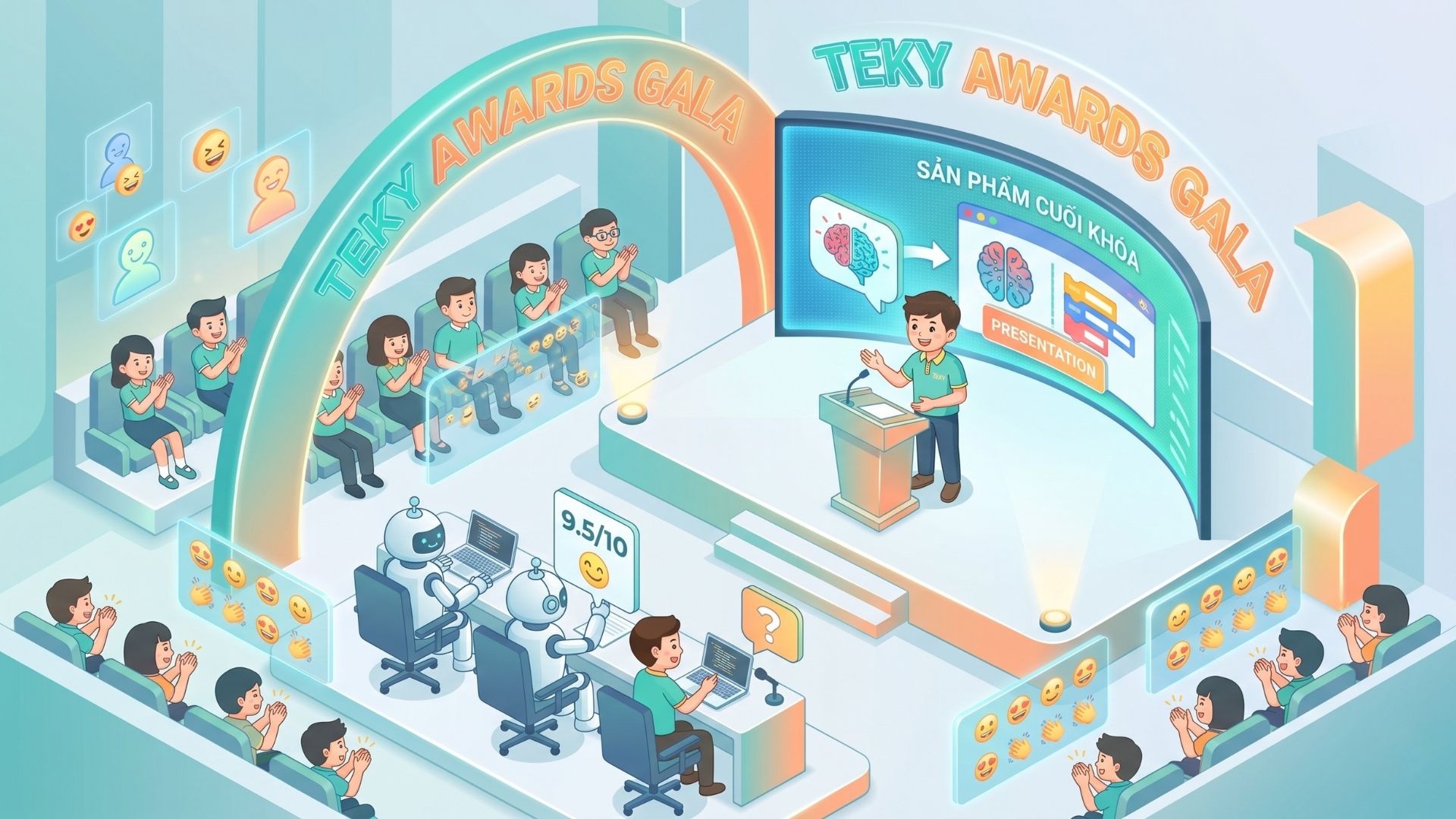 Để rèn luyện kỹ năng thuyết trình và bảo vệ dự án, trẻ cần một môi trường mô phỏng đủ tính nghiêm túc và khách quan. Các hoạt động như Teky Awards Gala được tổ chức không nhằm mục đích biểu diễn bề nổi, mà hoạt động như một hội đồng đánh giá học thuật thực sự.