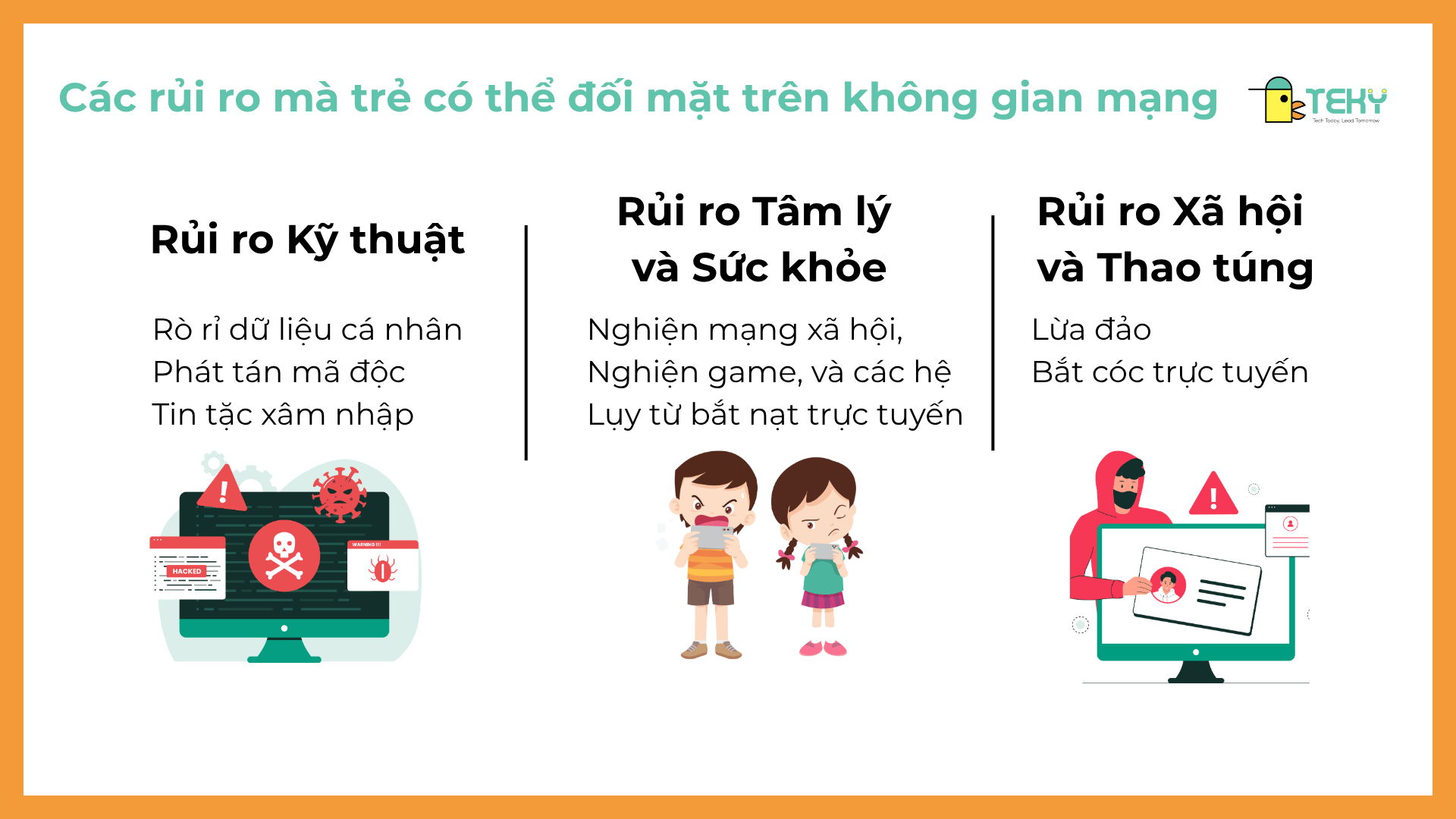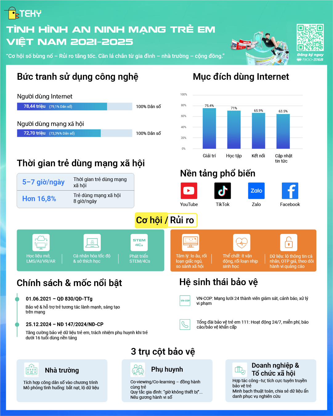 Với thời lượng sử dụng trung bình có thể lên tới 5–7 giờ mỗi ngày, trẻ em đang phải đối mặt với một hệ sinh thái rủi ro phức tạp, bao gồm các mối đe dọa kỹ thuật số (tin tặc, mã độc), nguy cơ xã hội (lừa đảo, bạo lực mạng), và các vấn đề sức khỏe tâm thần nghiêm trọng (nghiện mạng, nghiện game).