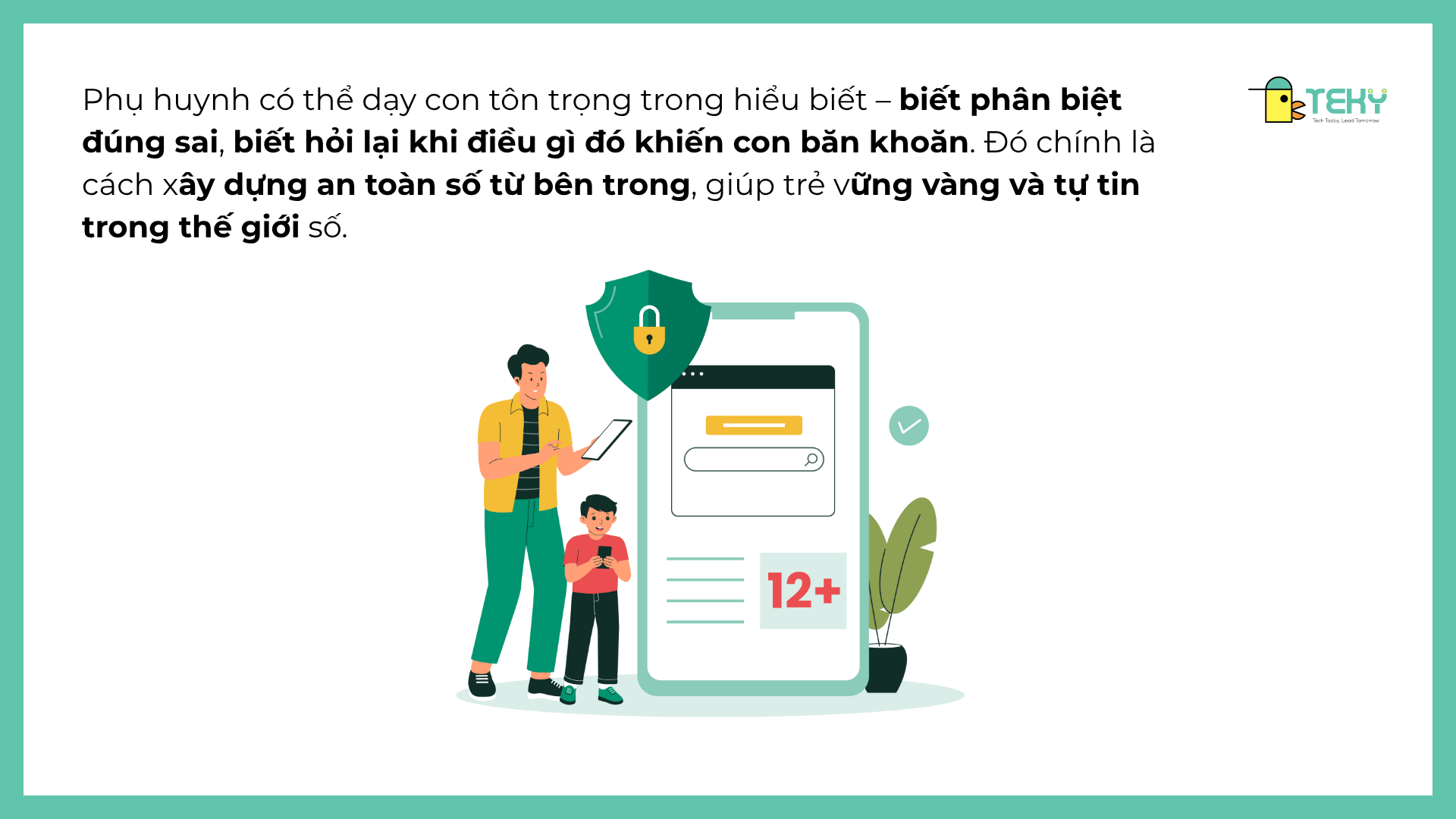 Vì vậy, thay vì “vâng lời tuyệt đối”, phụ huynh có thể dạy con tôn trọng trong hiểu biết – biết phân biệt đúng sai, biết hỏi lại khi điều gì đó khiến con băn khoăn. Đó chính là cách xây dựng an toàn số từ bên trong, giúp trẻ vững vàng và tự tin trong thế giới kết nối hôm nay.