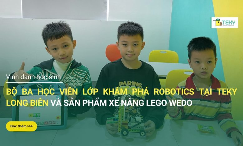 Bộ ba học viên lớp khám phá Robotics tại Teky Long Biên và sản phẩm xe nâng Lego Wedo