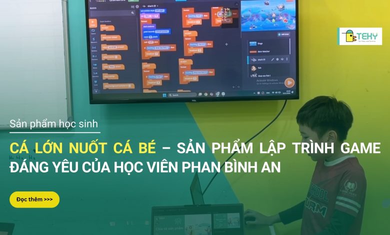 Sản phẩm lập trình game “Cá lớn nuốt cá bé” được thực hiện bởi học viên Phan Bình An trong quá trình tham gia khóa học Bé làm game tại Teky. Trò chơi được xây dựng từ một ý tưởng quen thuộc, nhưng có cấu trúc rõ ràng và luật chơi mạch lạc, thể hiện khả năng tư duy và sáng tạo của học viên ngay từ những bước đầu làm quen với công nghệ.