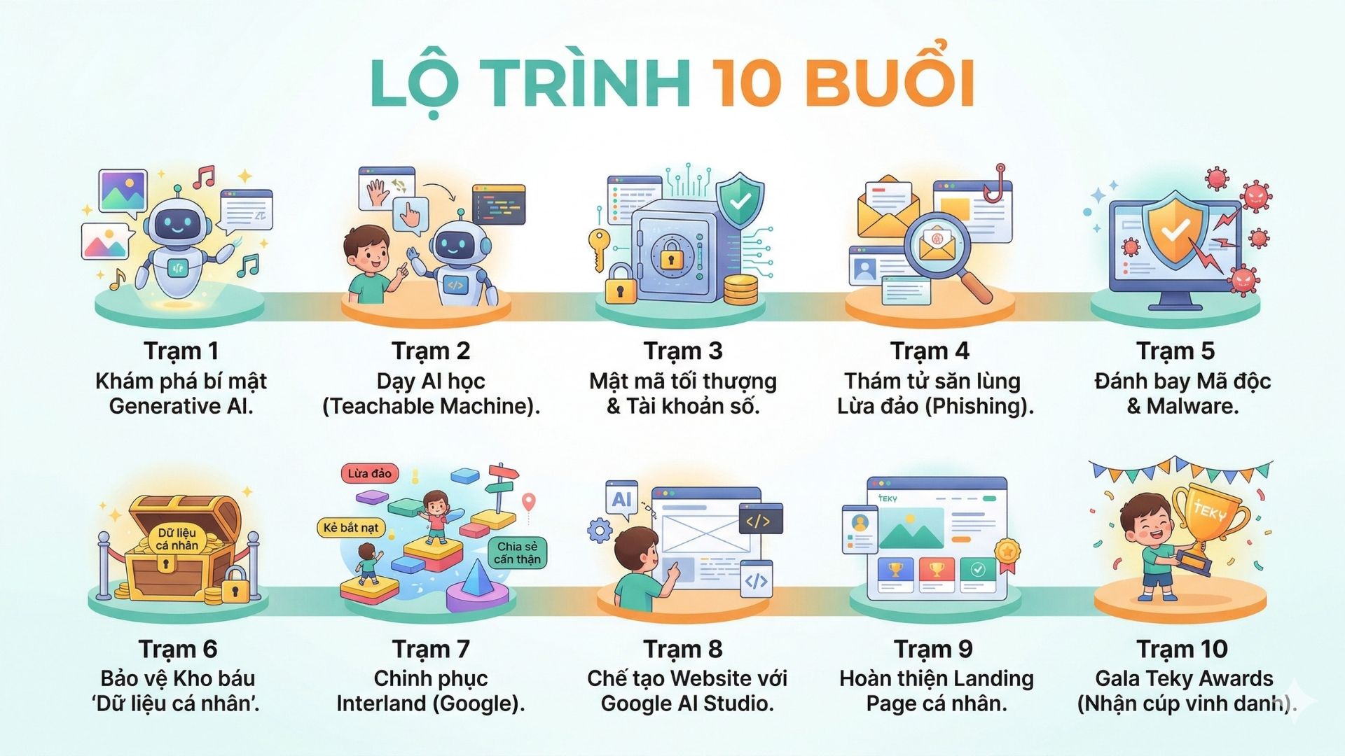 Với lộ trình 10 trạm thực chiến rõ ràng cùng sự hỗ trợ của các nền tảng AI tiên tiến nhất, khóa học là lựa chọn số 1, phù hợp với học sinh THCS trong việc hình thành tư duy hệ thống, trang bị kỹ năng sống còn trên không gian số để vững bước vào tương lai.
