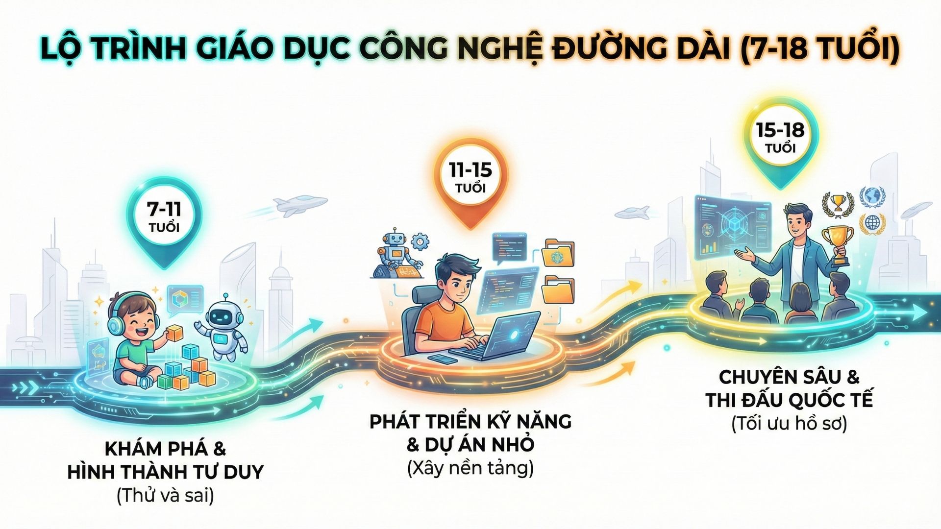- Lộ trình bài bản: Thiết kế chương trình liên thông từ cơ bản đến nâng cao theo chuẩn quốc tế (như chuẩn CSTA của Mỹ).