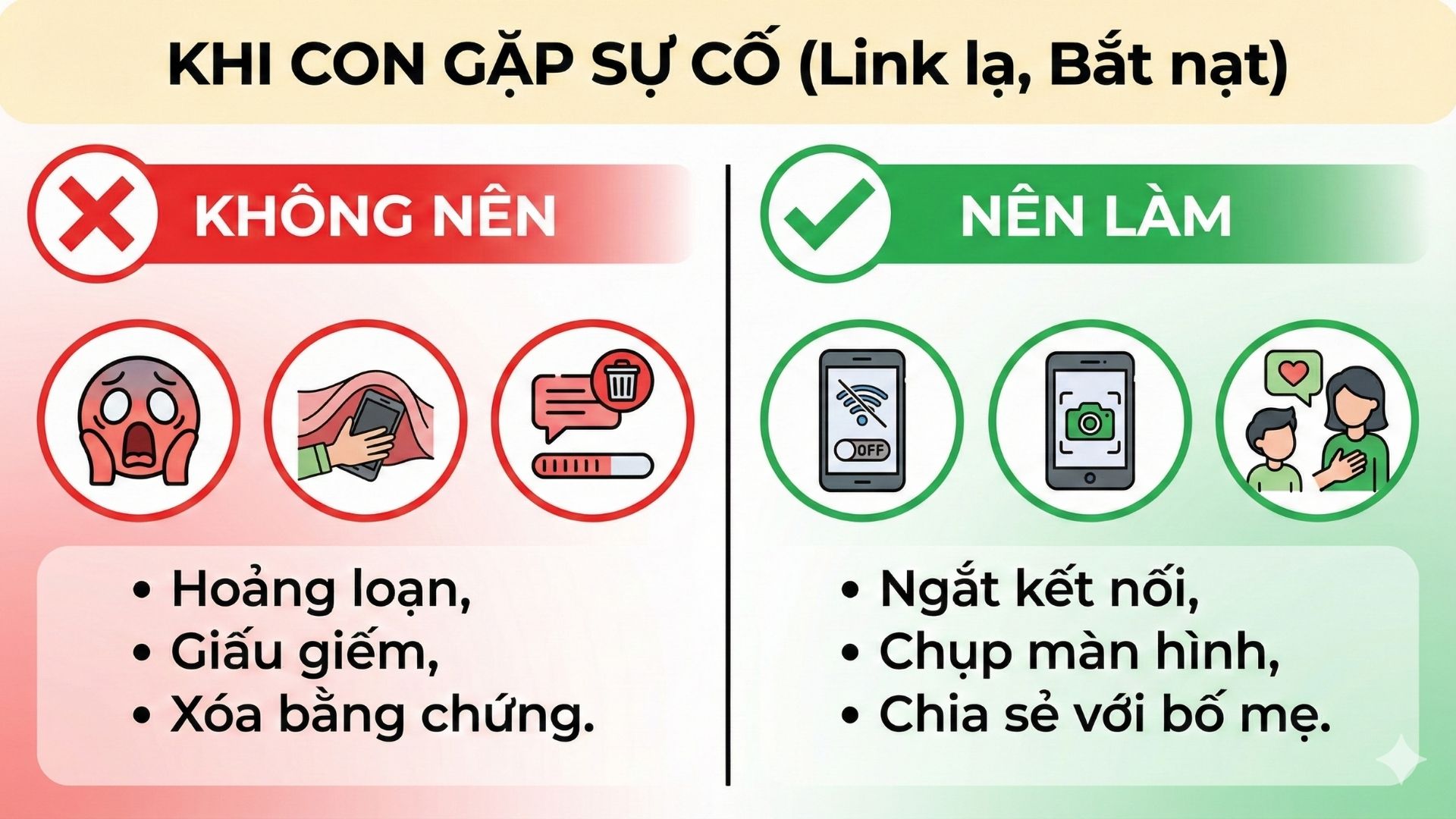 - Xử lý sự cố như một bài học: Khi con mắc lỗi (ví dụ: bấm link lạ), hãy coi đó là cơ hội giáo dục (Teachable moment) thay vì một lỗi lầm cần trừng phạt.
