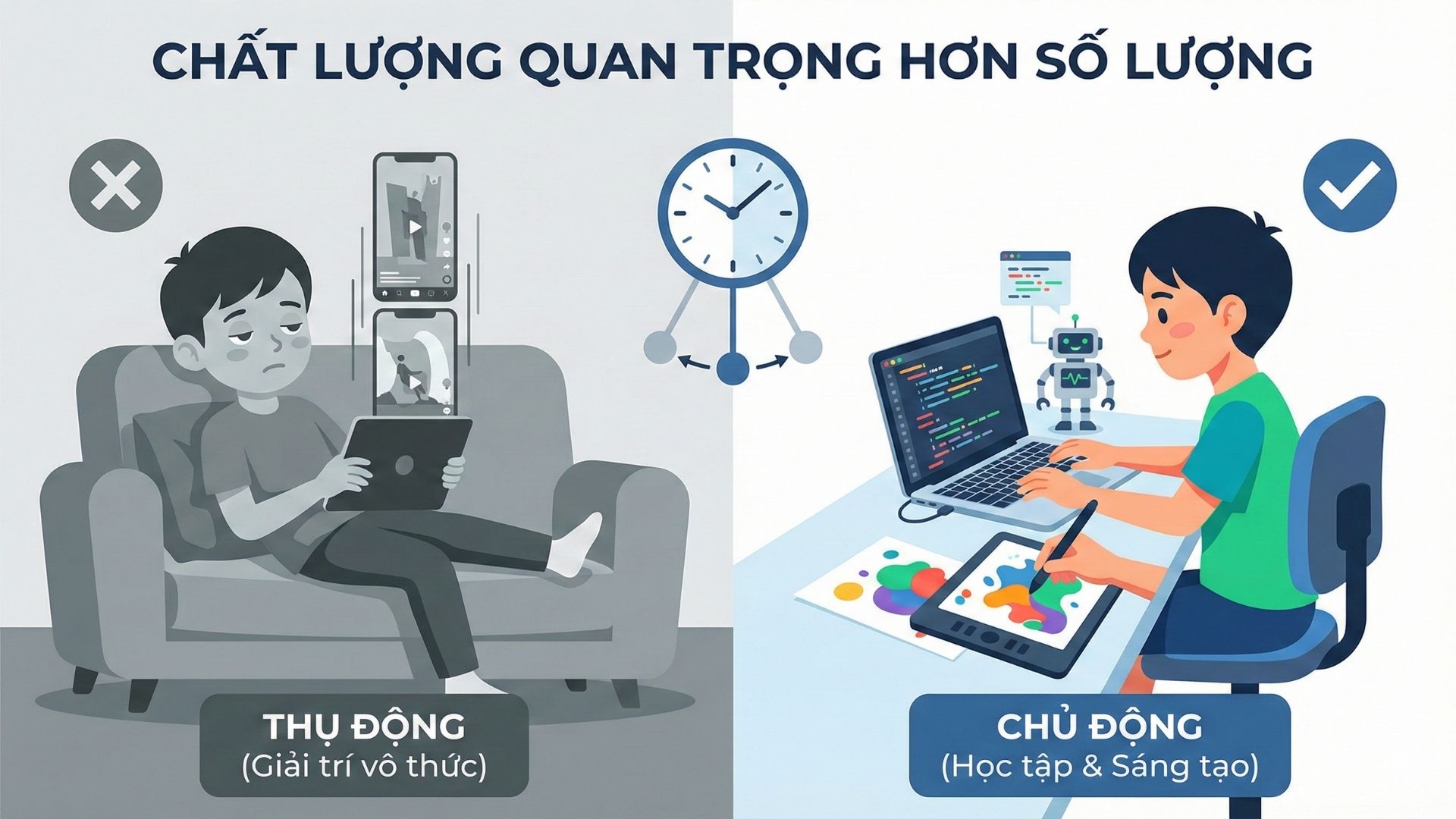 - Phân loại: Tách biệt thời gian “Màn hình thụ động” (giải trí) và “Màn hình chủ động” (học tập, sáng tạo).