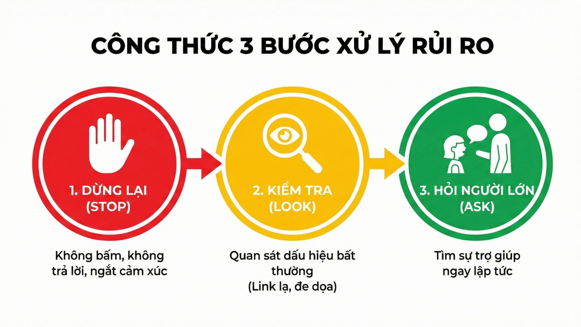 - Kiểm tra (Look): Quan sát dấu hiệu bất thường (đường link lạ, lời lẽ đe dọa).
