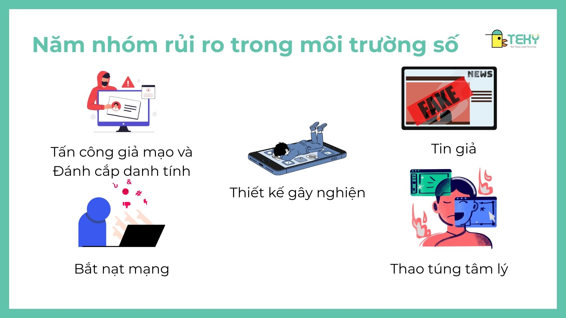 Giáo dục an ninh mạng cho trẻ không chỉ đơn thuần là cài phần mềm diệt virus. Nó là việc trang bị nhận thức để đối phó với 5 nhóm rủi ro phổ biến nhất hiện nay: