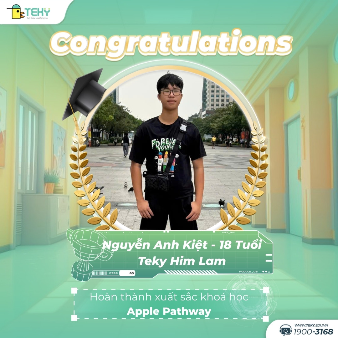 Sau hành trình gần 5 năm học tập và rèn luyện tại Teky, Nguyễn Anh Kiệt đã đạt được chứng nhận Apple Pathway – một dấu mốc đáng tự hào trong hành trình học công nghệ của mình.