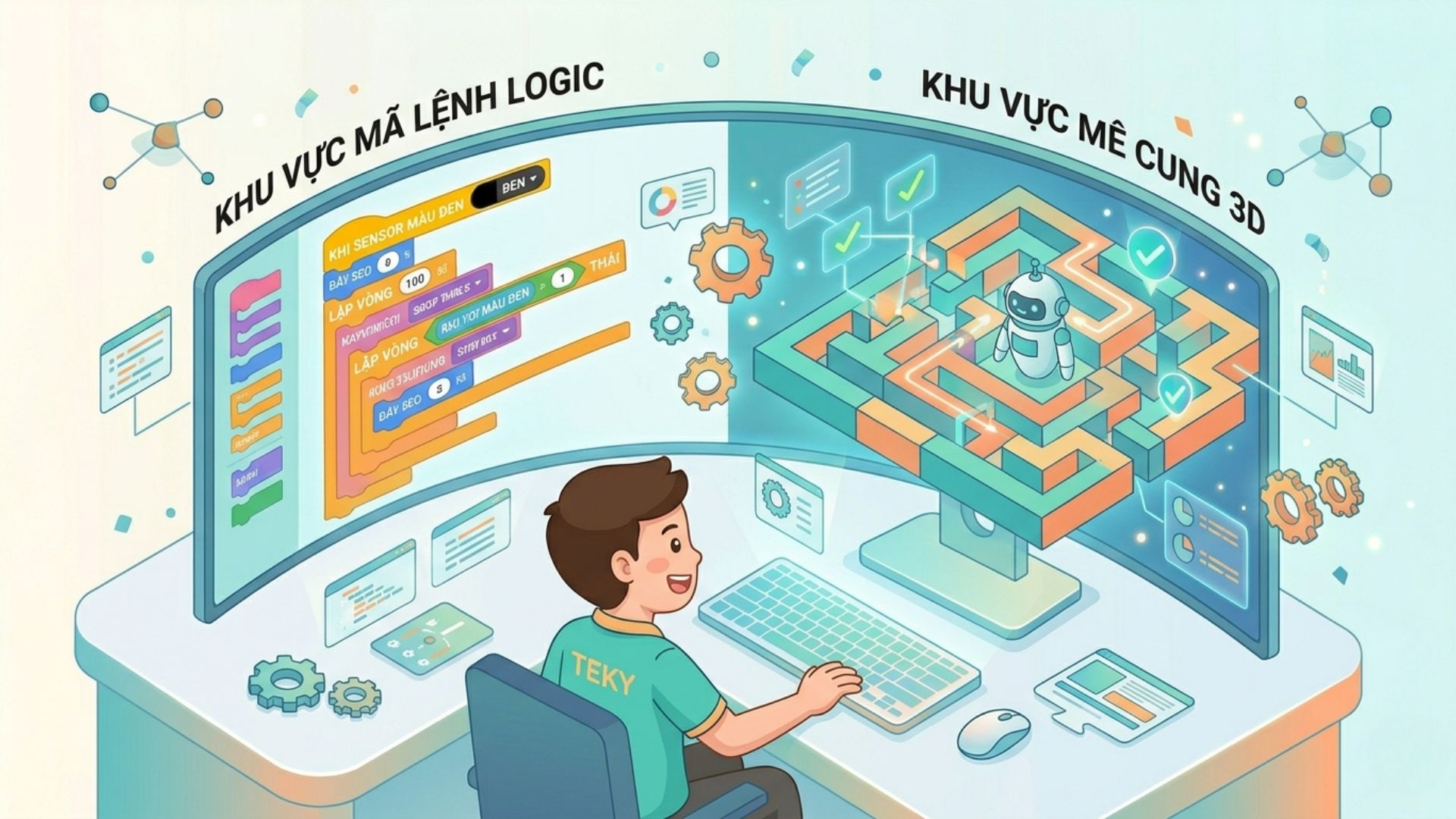 Thay vào đó, trong môi trường phòng thí nghiệm ảo, học sinh chỉ sử dụng một mô hình robot tự hành duy nhất. Thử thách không nằm ở việc đổi vỏ robot, mà ở việc viết thuật toán. Trẻ phải dùng các khối lệnh logic để lập trình cho chính con robot đó thực hiện nhiều nhiệm vụ khác nhau: từ việc dùng cảm biến màu sắc để phân loại hàng hóa nông nghiệp, đến việc dùng cảm biến siêu âm tìm đường thoát khỏi mê cung. Việc tập trung cao độ vào “nhiệm vụ” (mission-based learning) buộc trẻ phải liên tục tư duy, chia nhỏ bài toán phức tạp thành các khối lệnh tối ưu.