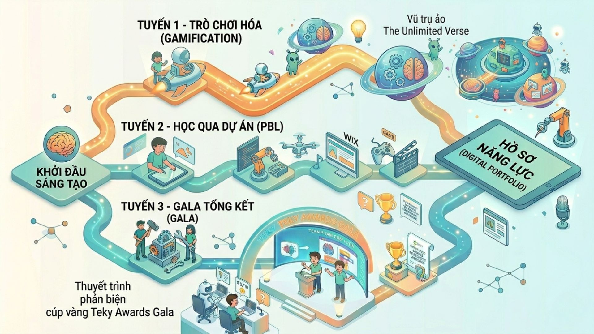 - Môi trường thực chứng Teky Awards Gala: Bước cuối cùng để “chống học vẹt”. Tại hội đồng đánh giá này, học sinh phải thuyết trình, giải thích rõ nguyên lý hoạt động của thuật toán và bảo vệ quyết định thiết kế trước các chuyên gia. Áp lực phản biện chính là môi trường tốt nhất để rèn luyện bản lĩnh và tư duy logic.