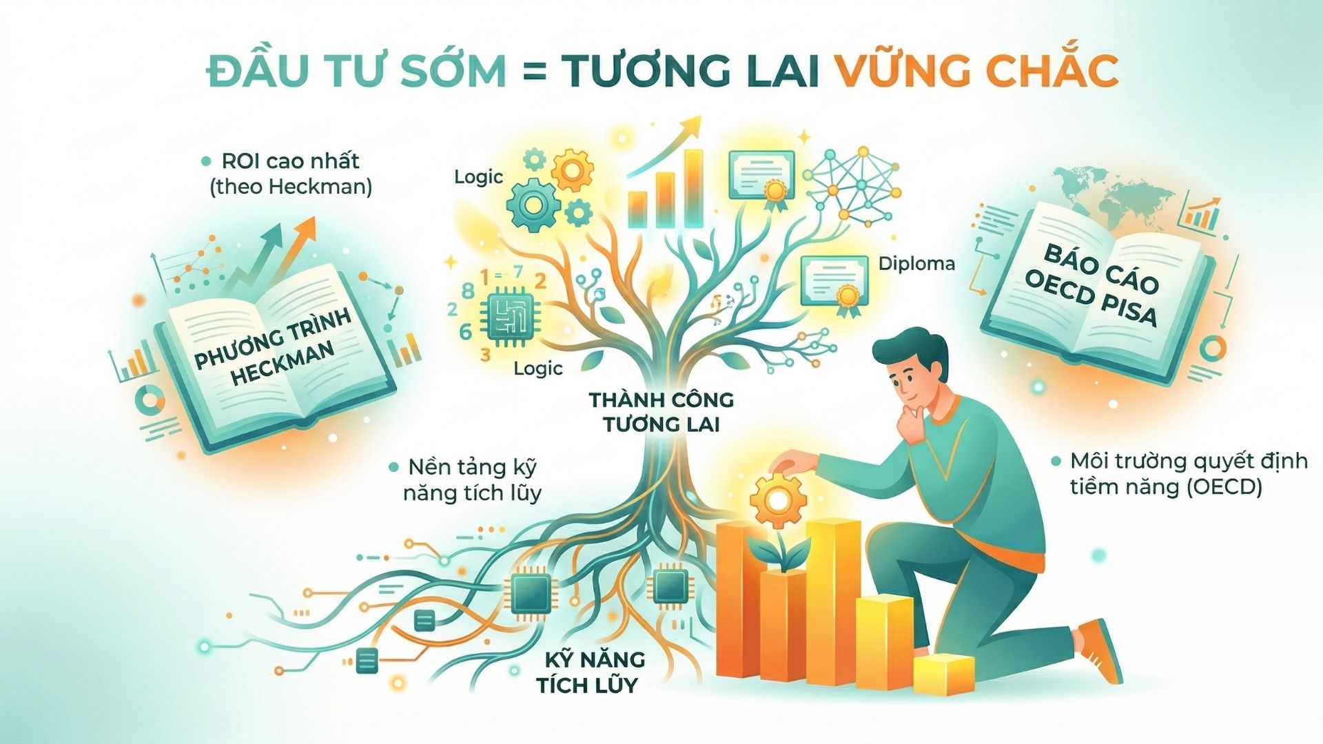 Điểm giao thoa giữa lý thuyết kinh tế học của Heckman và dữ liệu giáo dục của OECD mang đến một kết luận quan trọng: sự chênh lệch năng lực giữa các cá nhân khi trưởng thành phần lớn không xuất phát từ trí tuệ bẩm sinh đơn thuần. Khoảng cách này được hình thành từ sự khác biệt về điều kiện sống, môi trường học thuật và đặc biệt là những quyết định đầu tư giáo dục trong giai đoạn sớm. Nhận thức được quy luật này chính là bước đầu tiên để chúng ta tái cấu trúc lại cách tiếp cận trong việc nuôi dạy và định hướng tương lai cho thế hệ trẻ.