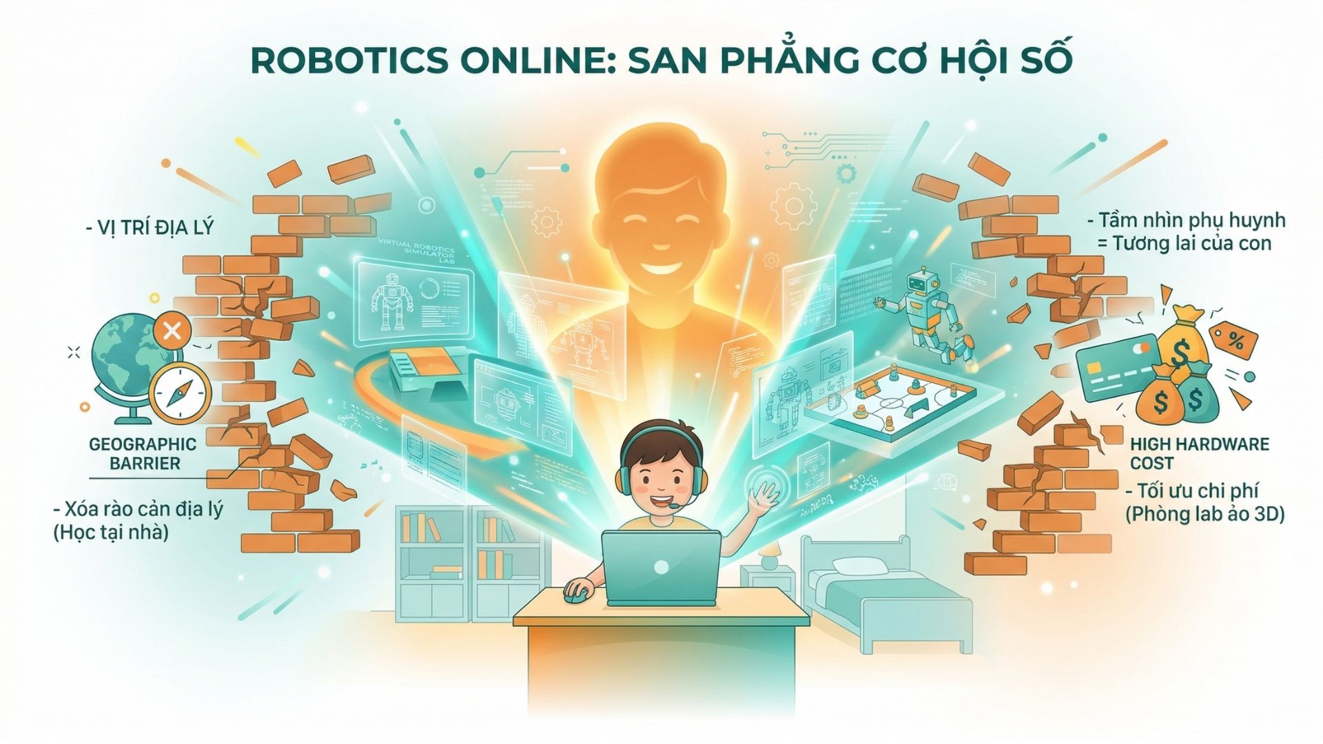 Truyền thống, môn học robotics thường bị giới hạn bởi yêu cầu về thiết bị phần cứng đắt tiền và không gian phòng lab chuyên dụng. Điều này vô hình trung biến môn học này thành rào cản đối với nhiều gia đình. Tuy nhiên, sự tiến bộ của công nghệ giáo dục (EdTech) đã tái định hình hoàn toàn cách thức truyền đạt kiến thức. Việc học robotics cho trẻ em hiện nay đã vượt ra khỏi những giới hạn vật lý. Sự ra đời của các nền tảng trực tuyến kết hợp với công nghệ mô phỏng (Virtual Simulator) đã tạo ra một môi trường học tập nơi sự kết hợp giữa tư duy thuật toán và công nghệ ứng dụng được diễn ra mượt mà ngay trên không gian số.