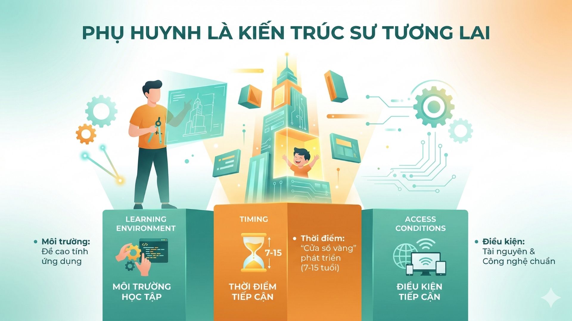 Sự kiến tạo của phụ huynh được thể hiện rõ nét qua ba nhóm quyết định mang tính chiến lược. Quyết định thứ nhất là thiết lập môi trường học tập: gia đình sẽ ưu tiên các khóa học rèn luyện tư duy sáng tạo hay chỉ tập trung vào điểm số truyền thống. Quyết định thứ hai liên quan đến thời điểm tiếp cận: nhận diện đúng độ tuổi nào con cần được làm quen với các kỹ năng của tương lai. Quyết định thứ ba là lựa chọn phương pháp học: tìm kiếm các hình thức giáo dục linh hoạt, ứng dụng công nghệ để vượt qua những giới hạn về địa lý và tối ưu hóa tài nguyên sẵn có.