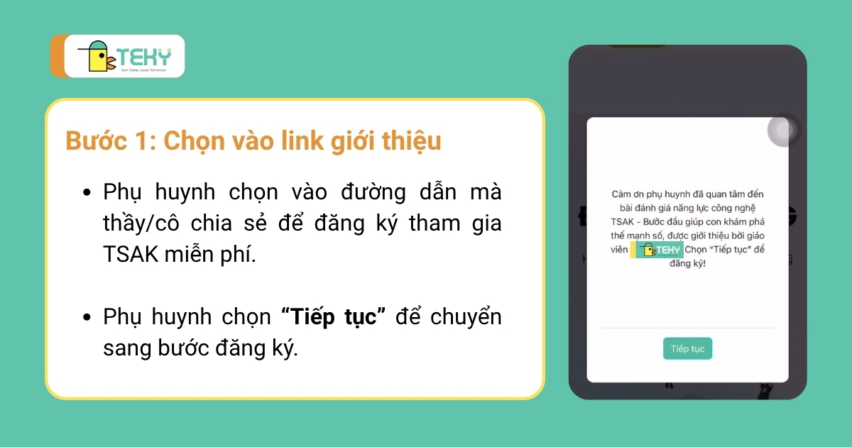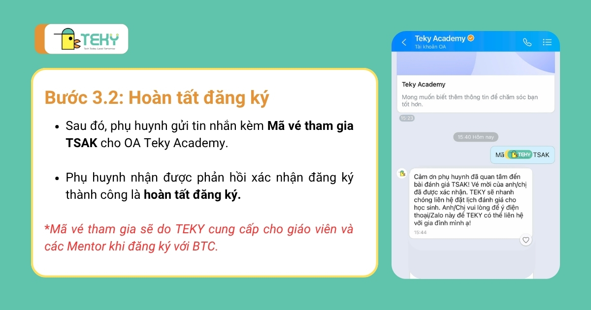 - Để hoàn tất đăng ký vé bài đánh giá TSAK, phụ huynh cần gửi tin nhắn chứa Mã vé tham gia TSAK (mã này do TEKY cung cấp cho giáo viên khi giáo viên đăng ký với Ban tổ chức).