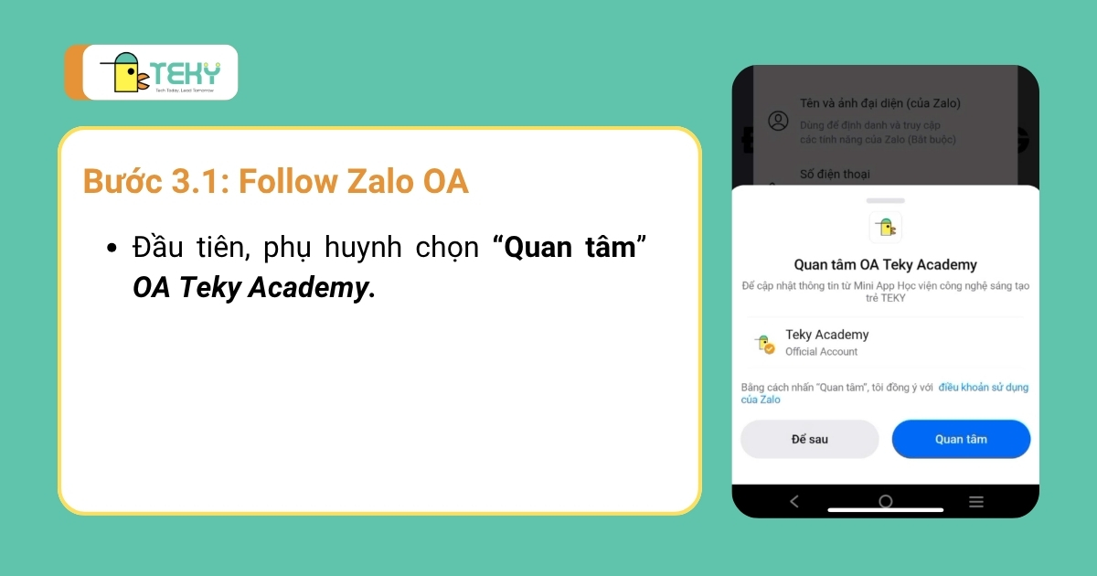 - “Quan tâm” Zalo OA Teky Academy: Giúp phụ huynh nhận được thông báo, hướng dẫn tham gia test và kết quả đánh giá.