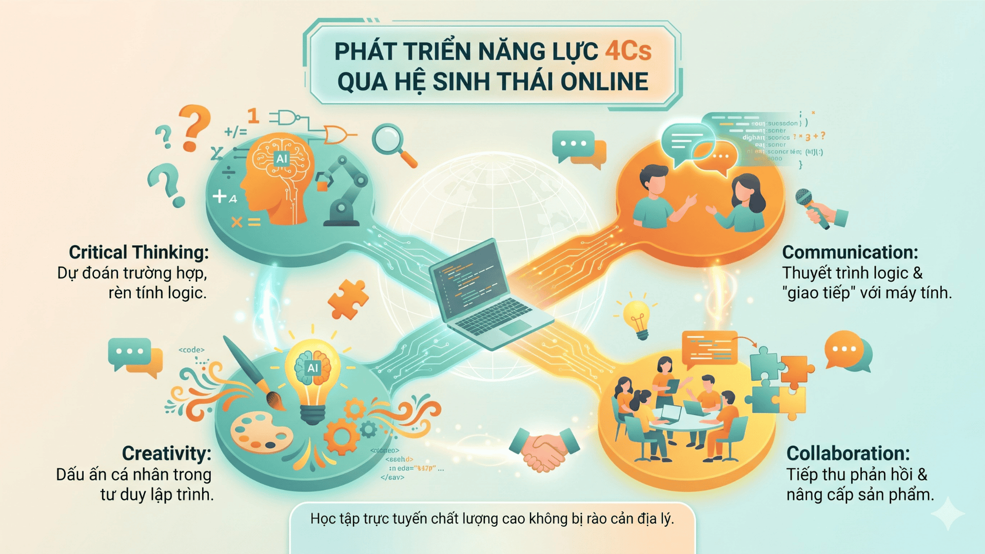Collaboration (Hợp tác): Dù tự tay viết code, nhưng trong quá trình học tập và làm dự án, Thái đã được rèn luyện kỹ năng trao đổi thông tin, nhờ sự trợ giúp từ giáo viên hướng dẫn khi gặp lỗi (bug) và biết cách tiếp thu phản hồi để nâng cấp sản phẩm của mình tốt hơn.