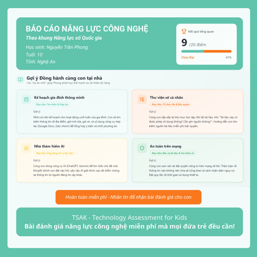 Chính vì vậy, việc đánh giá năng lực công nghệ một cách bài bản, khoa học và cá nhân hóa trở thành yêu cầu thiết yếu – không chỉ để nhận diện đúng năng lực công nghệ của trẻ mà còn để định hướng phát triển lâu dài. Đó là lý do bài test TSAK – Technology Skill Assessment for Kids ra đời và ngày càng được nhiều phụ huynh, cơ sở giáo dục lựa chọn như một công cụ hỗ trợ đồng hành cùng con trong hành trình học công nghệ.