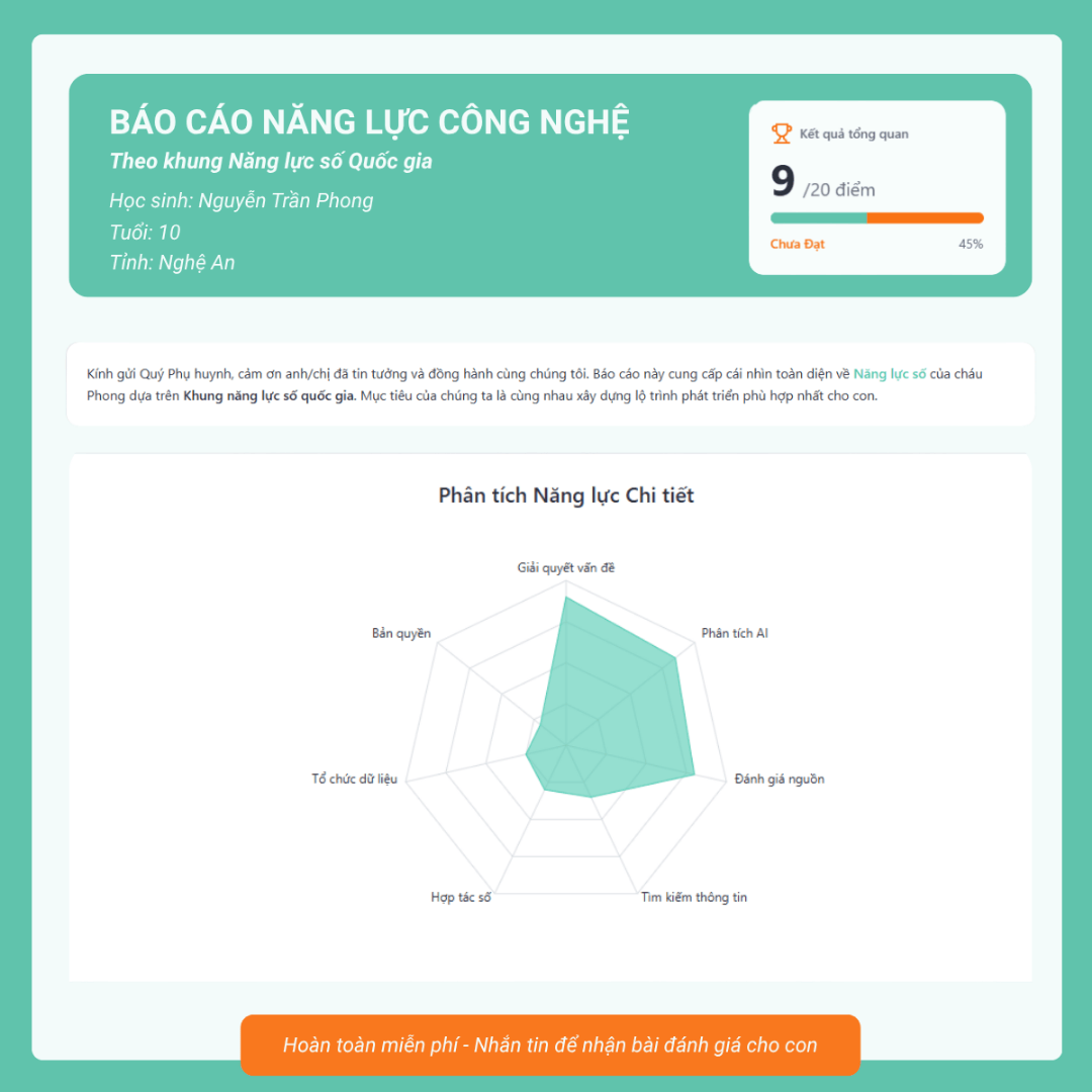 Trong xã hội số hiện nay, việc trẻ em tiếp cận và sử dụng công nghệ từ rất sớm là điều không còn xa lạ. Tuy nhiên, nhiều phụ huynh lại chỉ đánh giá năng lực công nghệ của con mình qua những biểu hiện cảm tính như “biết dùng máy tính”, “chơi game giỏi” hay “lướt mạng thành thạo”. Cách nhìn này vừa thiếu chính xác, vừa tiềm ẩn nguy cơ bỏ sót những điểm mạnh chưa được phát hiện, hoặc ngược lại, chưa nhận diện được những kỹ năng còn yếu kém.