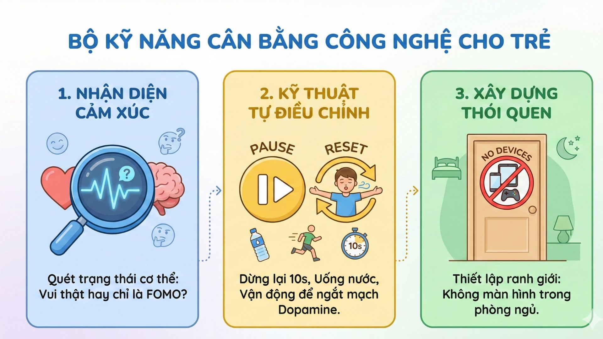 Việc cha mẹ tịch thu máy hay cài phần mềm giới hạn giờ là một hình thức kiểm soát từ bên ngoài. Nó có thể giảm thời lượng tiếp xúc, nhưng không dạy cho trẻ kỹ năng cốt lõi: Nhận diện cảm xúc của chính mình.