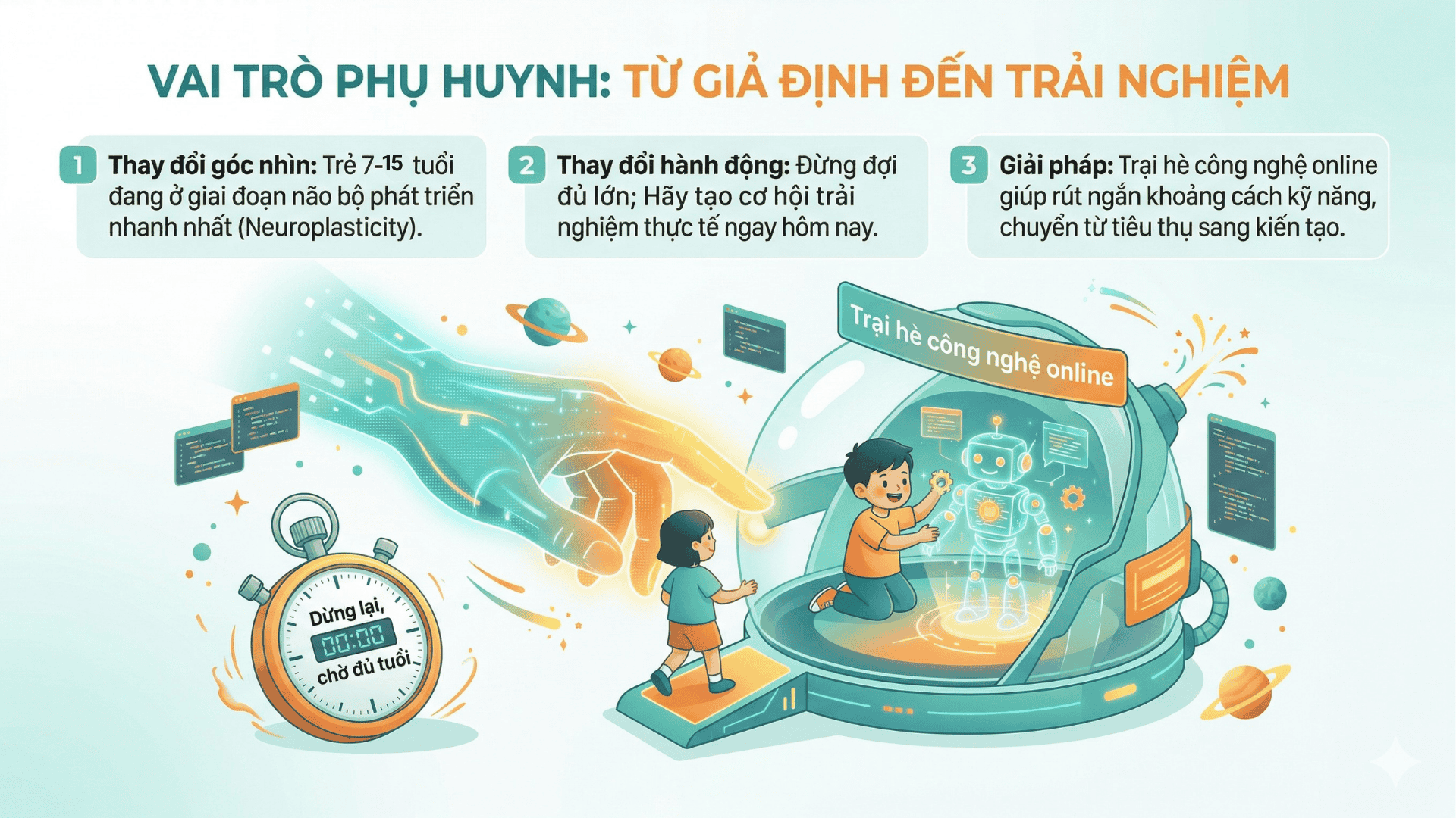 Việc tối ưu hóa 90 ngày hè phụ thuộc rất lớn vào hệ tư duy của cha mẹ. Nếu tiếp tục bám víu vào “giả định độ tuổi”, phụ huynh sẽ bỏ lỡ cơ hội vàng để khai phóng tiềm năng thực sự của con mình.