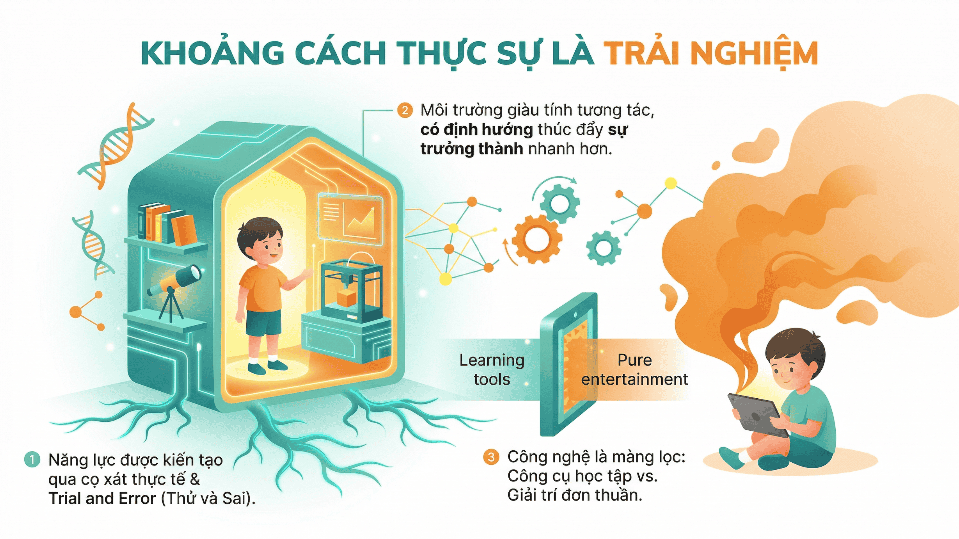 Sự phát triển vượt bậc của một cá nhân so với bạn bè đồng trang lứa là kết quả của một chuỗi trải nghiệm có chủ đích. Trong đó, mức độ tiếp xúc công nghệ đóng vai trò là một màng lọc quan trọng. Việc trẻ tương tác với thiết bị số như một công cụ học tập hay chỉ để giải trí đơn thuần sẽ tạo ra rẽ nhánh tư duy hoàn toàn khác biệt.