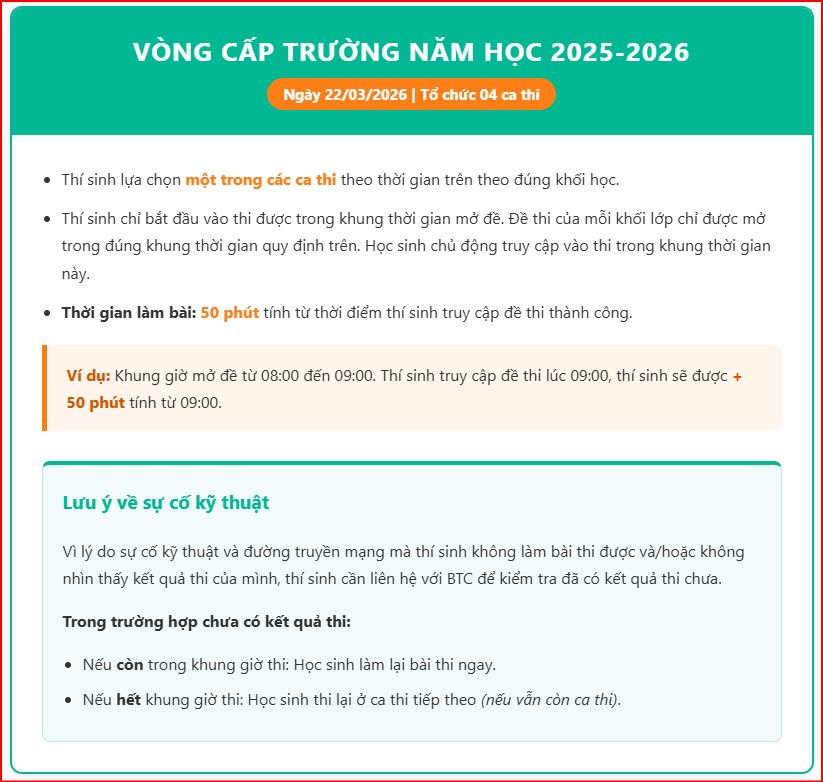 Thông tin nóng hổi nhất từ Ban tổ chức: Vòng thi cấp trường năm học 2025-2026 sẽ diễn ra duy nhất trong một (01) ngày: 22/03/2026.
