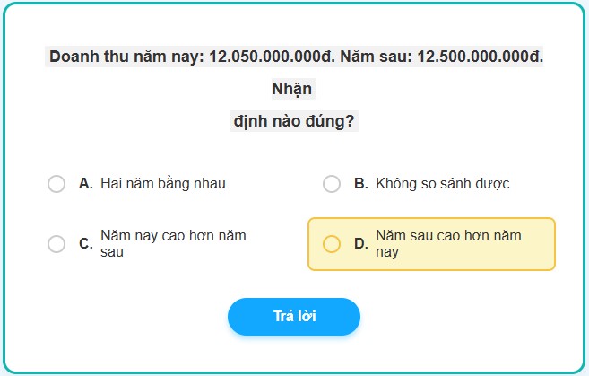 💡 Bí kíp phân tích: Với những con số có quá nhiều số 0, đừng hoảng! Hãy áp dụng nguyên tắc so sánh từ trái qua phải. Cùng là 12 tỷ, nhưng ở hàng chục triệu, năm sau là 50 triệu, trong khi năm nay chỉ có 05 triệu. Chỉ cần nhìn vào sự khác biệt nhỏ này là đủ để chốt đáp án D!