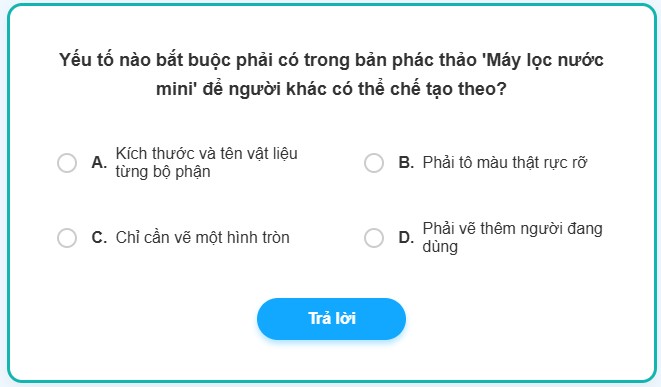 💡 Bí kíp tư duy kỹ sư: Bản phác thảo không phải là một bức tranh nghệ thuật để cần “tô màu rực rỡ”. Mục đích của nó là để người khác có thể chế tạo theo. Nếu không có kích thước chính xác và biết dùng vật liệu gì (nhựa, bông, than hoạt tính…), thì không ai có thể làm ra được sản phẩm thực tế cả.