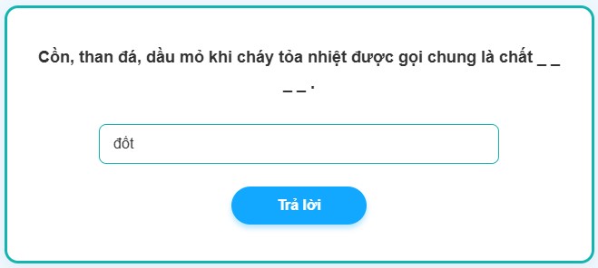💡 Bí kíp liên tưởng: Hãy bám sát vào các “từ khóa” trong câu hỏi. “Cháy” và “tỏa nhiệt” là đặc tính nổi bật nhất của nhiên liệu dùng để cung cấp năng lượng. Liên hệ với kiến thức Khoa học cơ bản, ta dễ dàng điền được từ “đốt”.