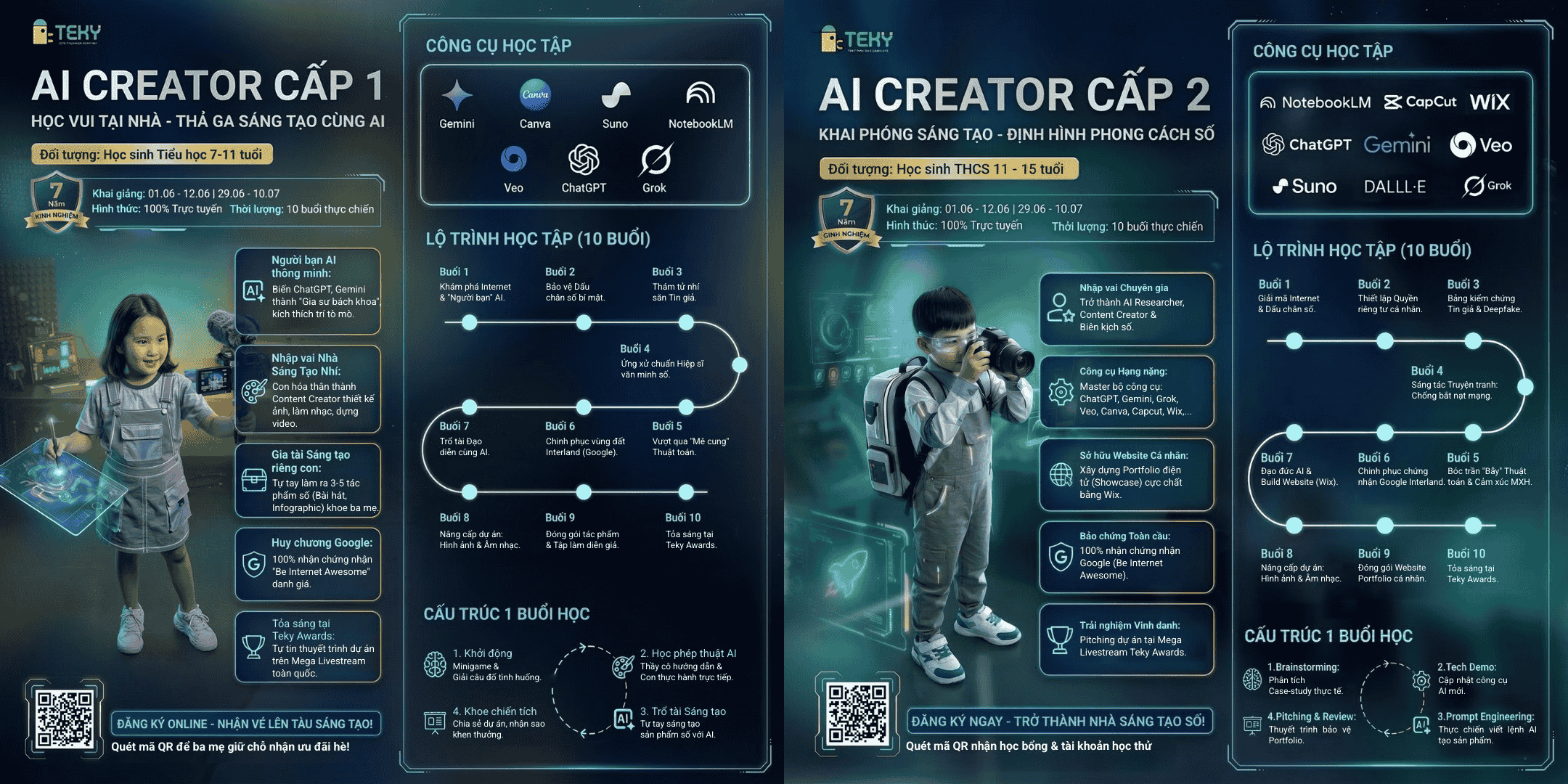 Sự dịch chuyển từ “Tiêu thụ” sang “Kiến tạo” hiếm khi xảy ra một cách tự phát. Trẻ em cần một hệ sinh thái học tập có tính cấu trúc, được dẫn dắt bởi chuyên gia và có lộ trình thực chiến rõ ràng. Đây là lý do các chương trình chuyên biệt như trại hè công nghệ online AI Creator đang trở thành xu hướng giáo dục hiện đại được nhiều phụ huynh trí thức lựa chọn.