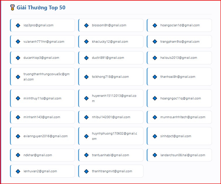 Bảng vàng sự kiện Top 50 gồm các bạn có email sau: