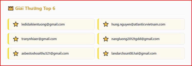 Bảng vàng sự kiện Top 6 gồm các bạn có email sau: