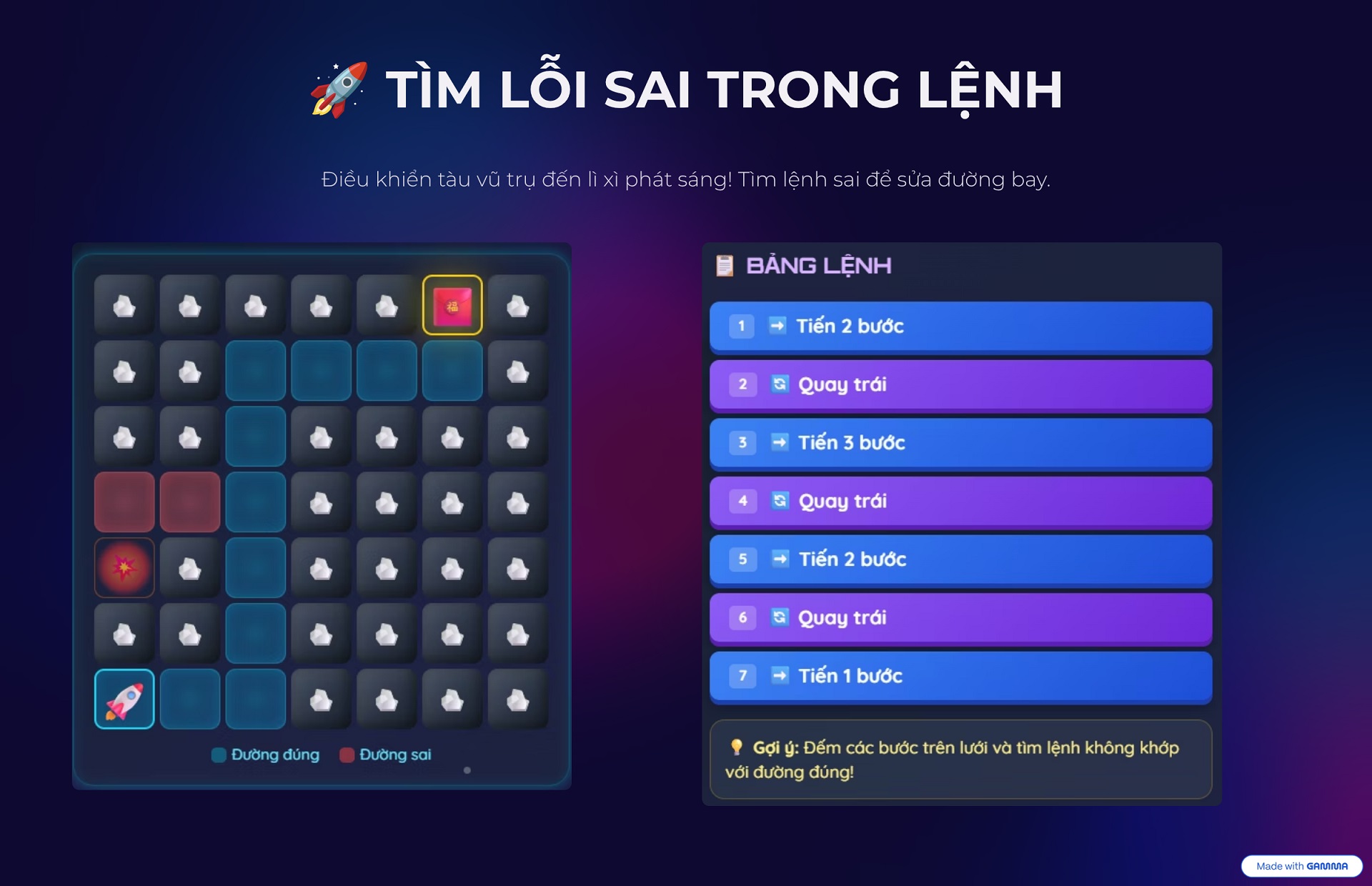 Chưa hết, các bạn còn được thử tài làm “cơ trưởng” tìm lỗi sai trong bảng lệnh để điều khiển phi thuyền đi đúng đường lấy quà.
