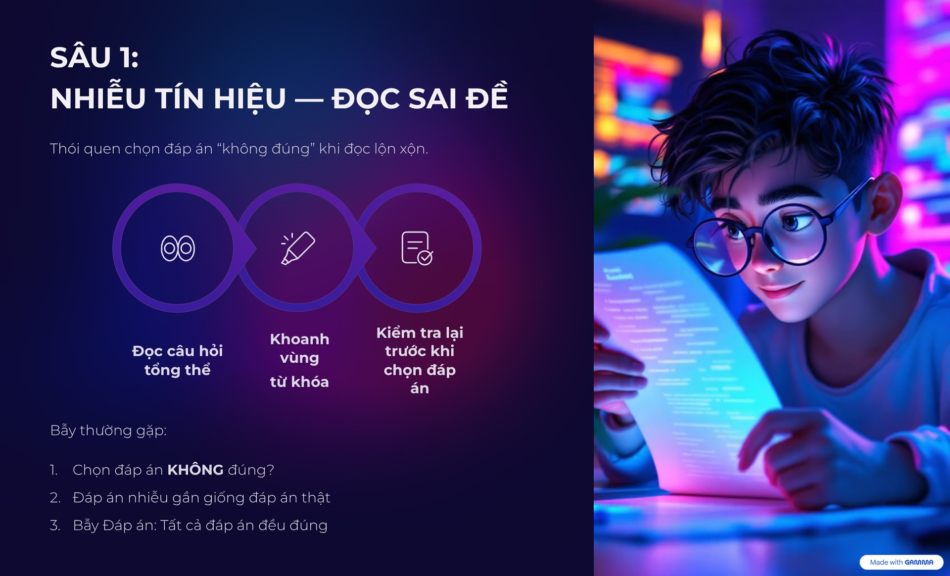 Sâu 1 – Nhiễu tín hiệu (Đọc sai đề): Rất nhiều bạn mắc bẫy khi đọc lướt và không để ý các từ khóa như chọn đáp án “KHÔNG đúng”, hoặc dính bẫy đáp án nhiễu gần giống đáp án thật.