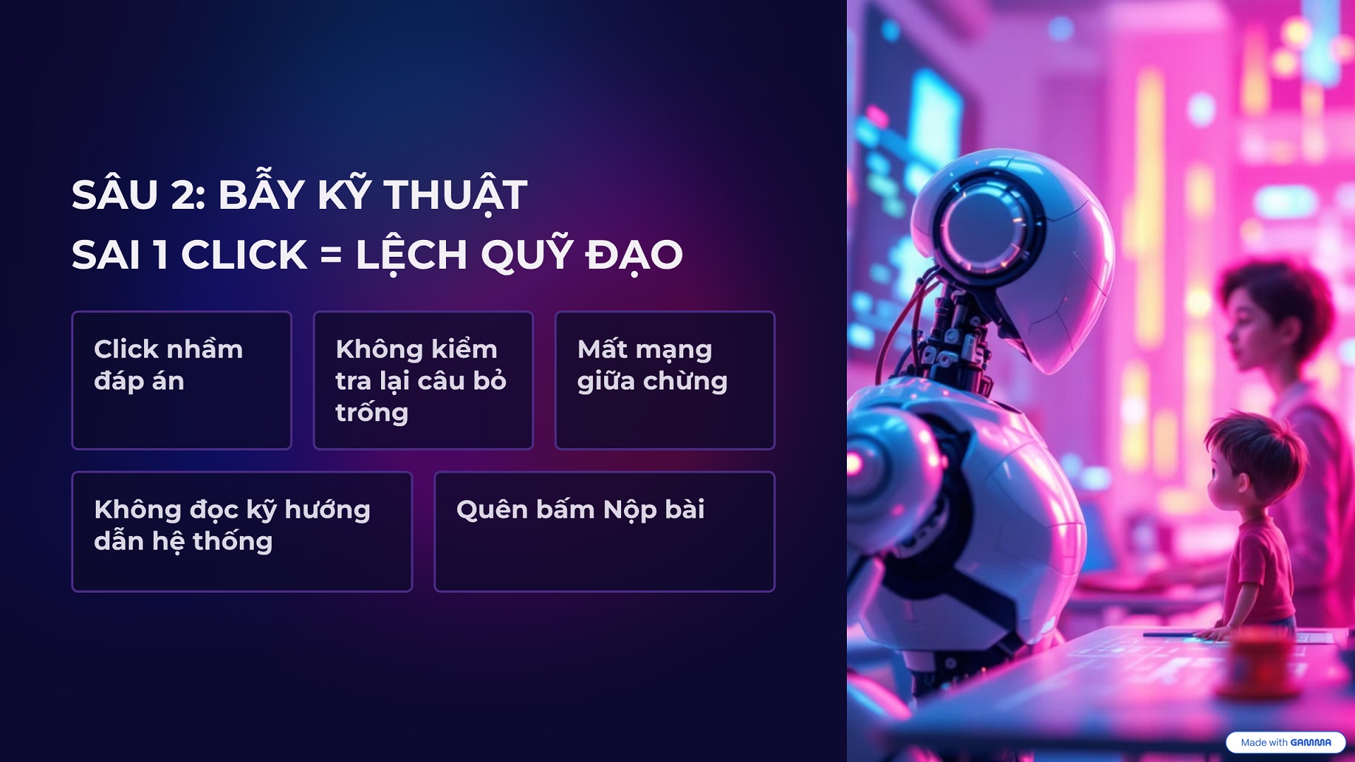 Sâu 2 – Bẫy kỹ thuật: Sai 1 click là lệch cả quỹ đạo!. Đừng để mất điểm oan vì click nhầm đáp án, rớt mạng giữa chừng, hay đau đớn nhất là… quên bấm Nộp bài.