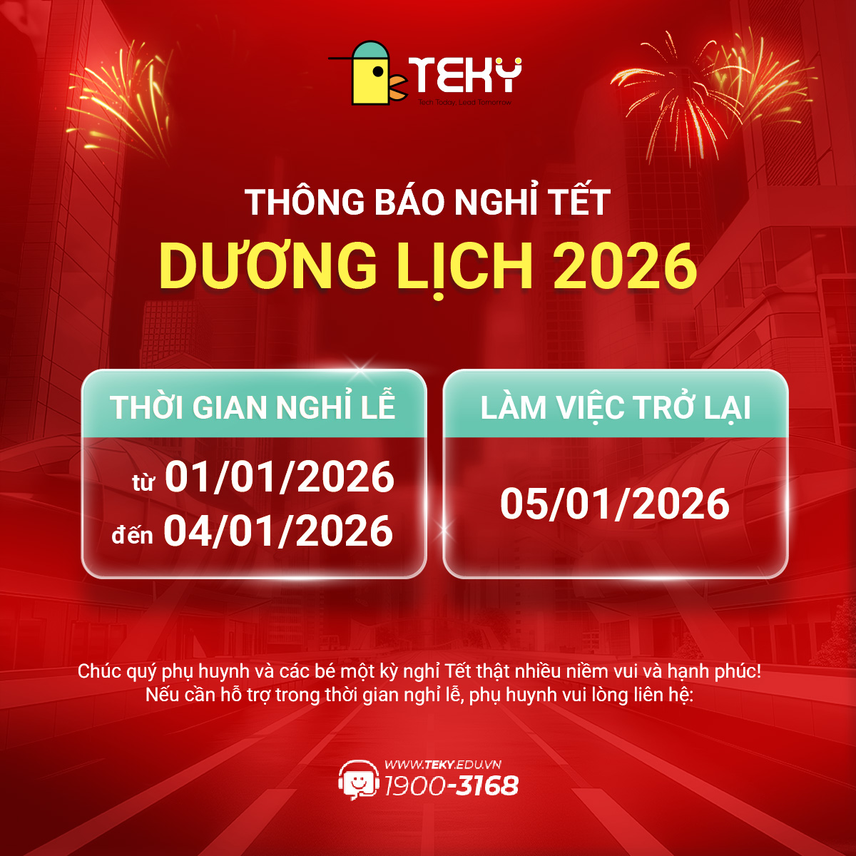 Trong thời gian nghỉ lễ nêu trên, các lớp học trực tiếp và trực tuyến của Teky sẽ tạm dừng theo kế hoạch chung. Toàn bộ hoạt động giảng dạy, tư vấn học tập và hỗ trợ học viên sẽ được khôi phục bình thường kể từ ngày 05/01/2026.