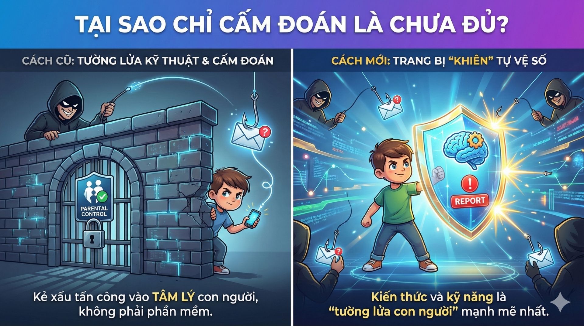 An toàn thực sự không đến từ việc tước bỏ công cụ, mà đến từ năng lực nội tại của trẻ. Một đứa trẻ có kiến thức an ninh mạng sẽ biết cách tự bảo vệ mình ngay cả khi không có bố mẹ giám sát.