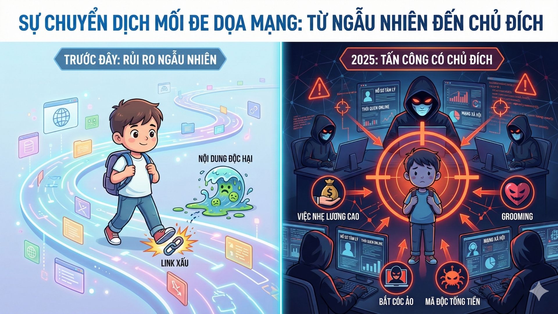 Trong suốt một thập kỷ qua, khi nói đến an ninh mạng cho trẻ, phần lớn phụ huynh thường hình dung về những rủi ro mang tính “tai nạn” ngẫu nhiên: con vô tình bấm vào một đường link xấu, con nhìn thấy một hình ảnh bạo lực, hay con bị cuốn vào một trò chơi điện tử. Tuy nhiên, bước sang năm 2025, bối cảnh số đã thay đổi một cách căn bản và tàn khốc hơn.