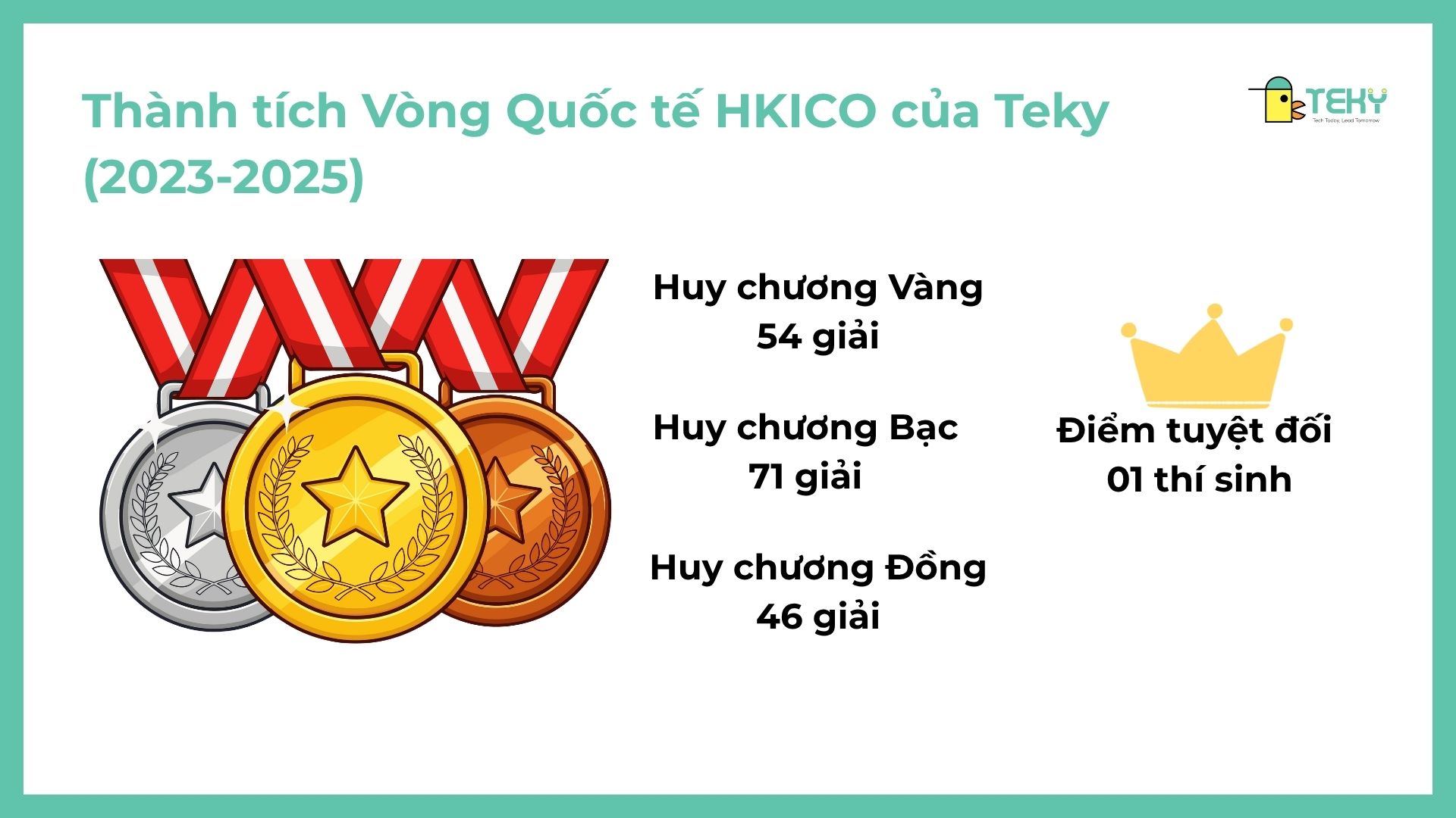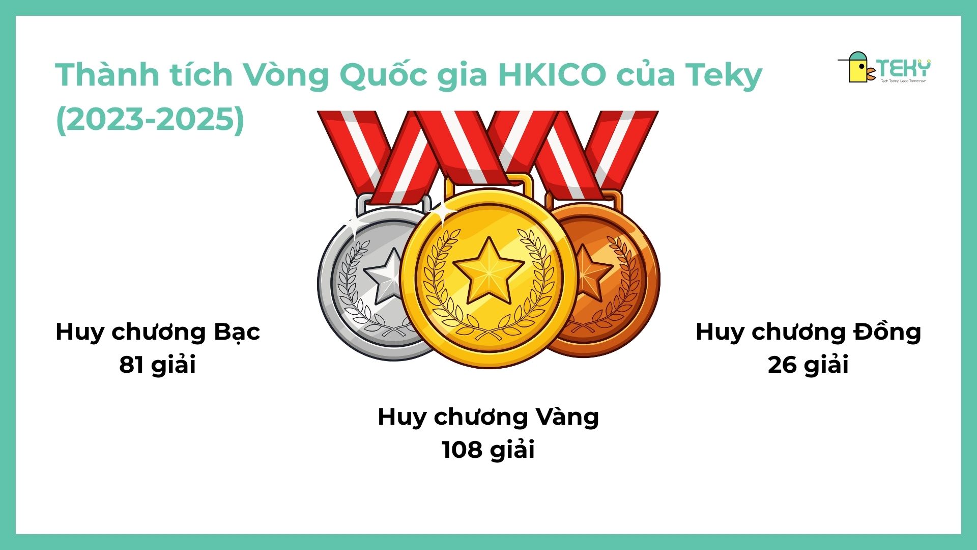 Điểm khác biệt này thể hiện rõ nhất qua thành tích học sinh Teky tại hai đấu trường lớn: HKICO và Enjoy AI trong giai đoạn 2023–2025.