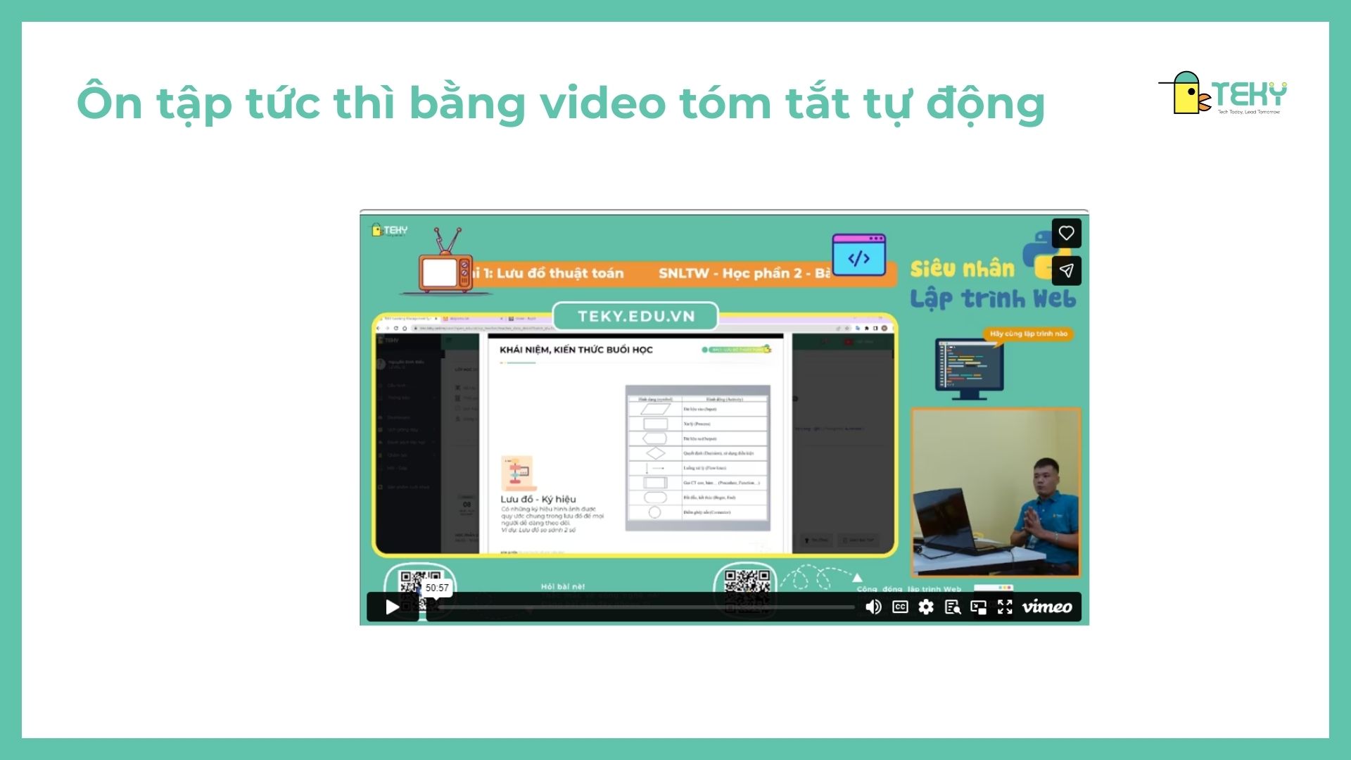 Teky LMS giải quyết vấn đề này bằng tính năng tự động tạo video tóm tắt ngay sau mỗi buổi học.