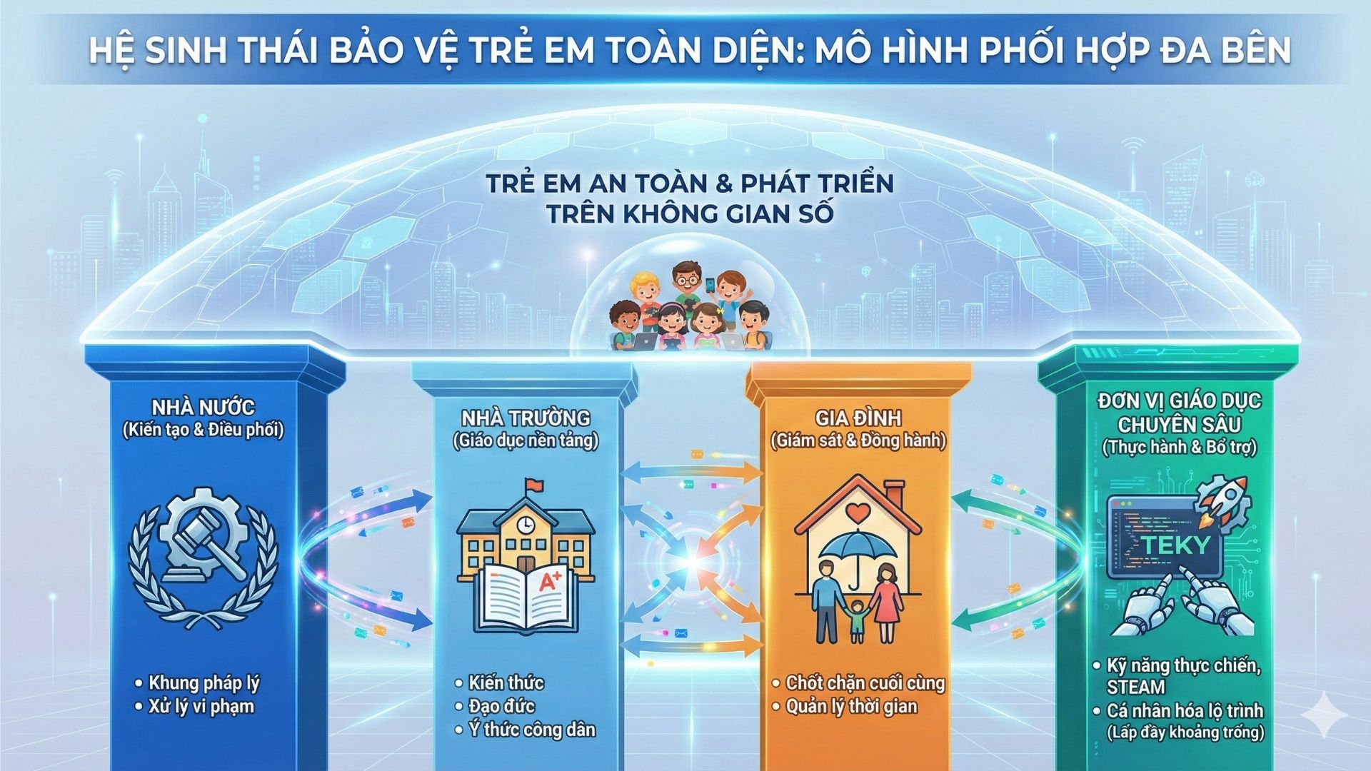 Bảo vệ trẻ em trên không gian mạng là một bài toán tổng thể đòi hỏi sự phối hợp chặt chẽ của mô hình “Kiềng ba chân”: Nhà nước – Nhà trường – Gia đình, cùng sự tham gia của các đơn vị giáo dục tư nhân.