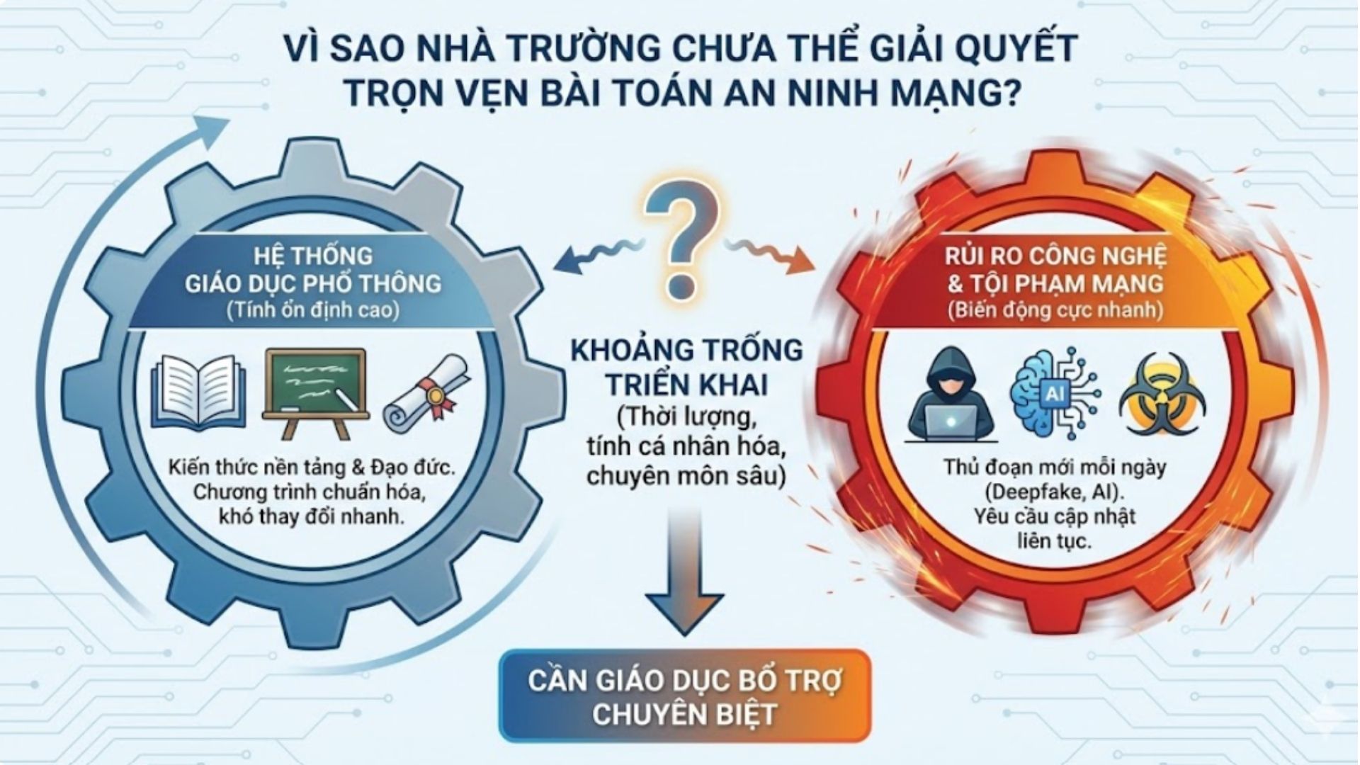 Chính sự lệch pha giữa tính ổn định của chương trình giáo dục phổ thông và tốc độ thay đổi chóng mặt của rủi ro mạng đã tạo ra một “khoảng trống triển khai”: