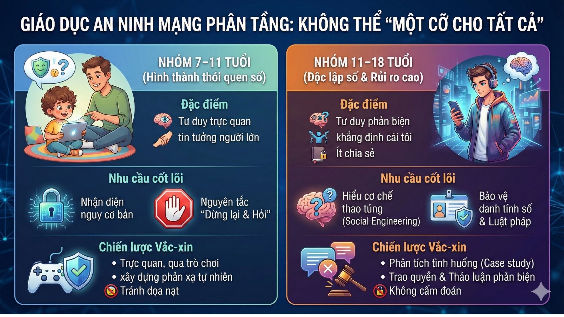Một sai lầm phổ biến trong giáo dục an toàn số là áp dụng cùng một cách tiếp cận cho mọi lứa tuổi. Thực tế, sự phát triển tâm sinh lý và thói quen sử dụng Internet của trẻ ở độ tuổi 7-11 hoàn toàn khác biệt so với lứa tuổi 11-18. Giáo dục an ninh mạng cho trẻ hiệu quả cần sự phân tầng rõ rệt.