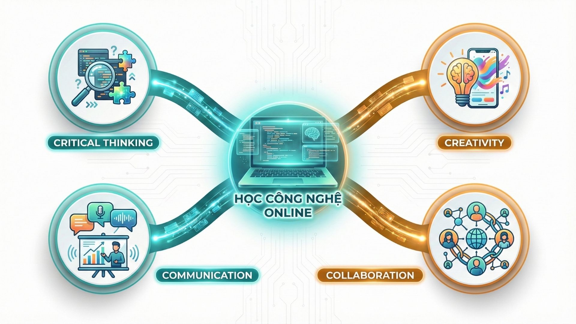 Trong bối cảnh học công nghệ online, 4Cs không tồn tại độc lập. Chúng gắn chặt vào cách học sinh tiếp cận một bài toán lập trình, cách các em phối hợp thực hiện một dự án game hay cách các em trình bày giải pháp của mình trước lớp học ảo. Khi trẻ học công nghệ trong một trường học công nghệ online cho trẻ, các em thực tế đang được huấn luyện để đáp ứng chuẩn năng lực làm việc tại các tập đoàn đa quốc gia hoặc các môi trường đại học danh tiếng thế giới.