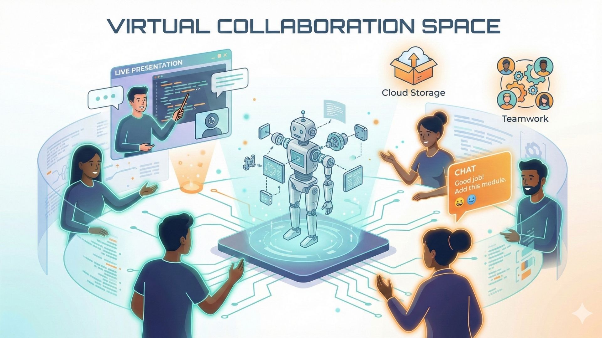 Trong một trường học công nghệ online cho trẻ, việc hợp tác diễn ra qua các nền tảng như Google Workspace, GitHub hay các phòng thảo luận nhóm (Breakout rooms) của ClassIn. Trẻ học được cách: